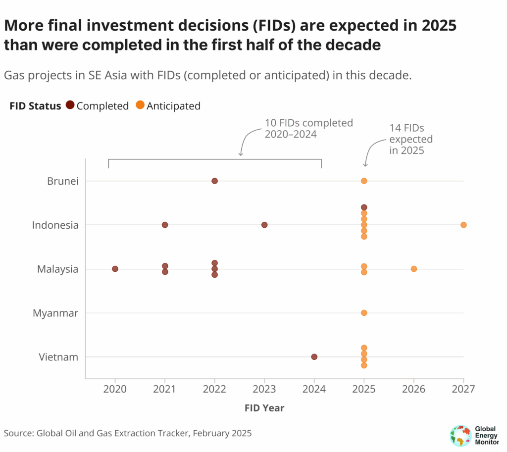 Aside from the ambitious gas buildup and LNG import plans, Southeast Asia is also considering ramping up extraction. According to GEM, the region has the highest number of final investment decisions (FIDs) on oil and gas extraction projects this decade, with over 20 billion cubic metres (bcm) annually of new production capacity potentially in the works. This amounts to an 18% increase over current output.