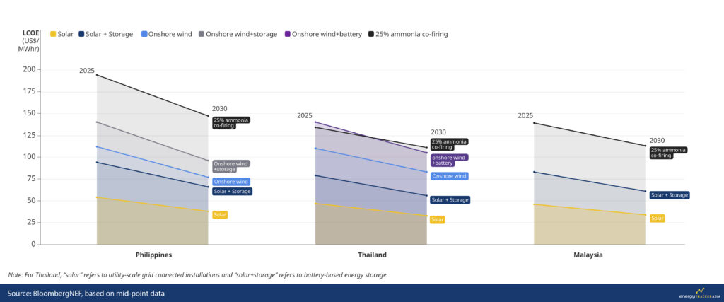 In a series of country-specific reports, BloombergNEF has found that solar and solar paired with battery storage technology are already cheaper than ammonia co-firing in the Philippines, Thailand and Malaysia. Furthermore, as of 2025, onshore wind is also cheaper than ammonia co-firing in the Philippines and Thailand. In the Philippines, onshore wind in combination with battery storage is now more affordable than ammonia co-firing, while in Thailand, it will become so by 2030.